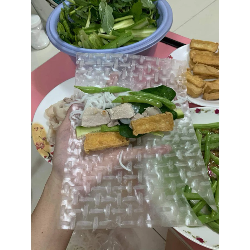 Nếu muốn làm bánh tráng trộn, khách iu có thể cắt nhỏ miếng vuông trộn tí mỡ hành, Muối Tôm, ăn là ghiền. Bánh tráng mỏng và mềm, dễ ăn và dễ sử dụng. Bánh tráng có 3 phân loại để khách iu dễ lựa chọn: màu hồng (120g), màu xanh lá (220g), màu trắng (450g).